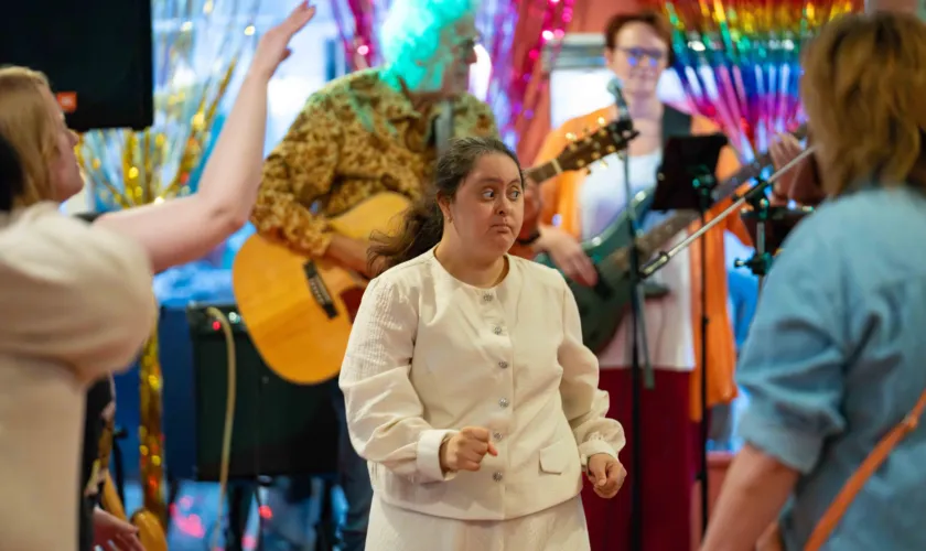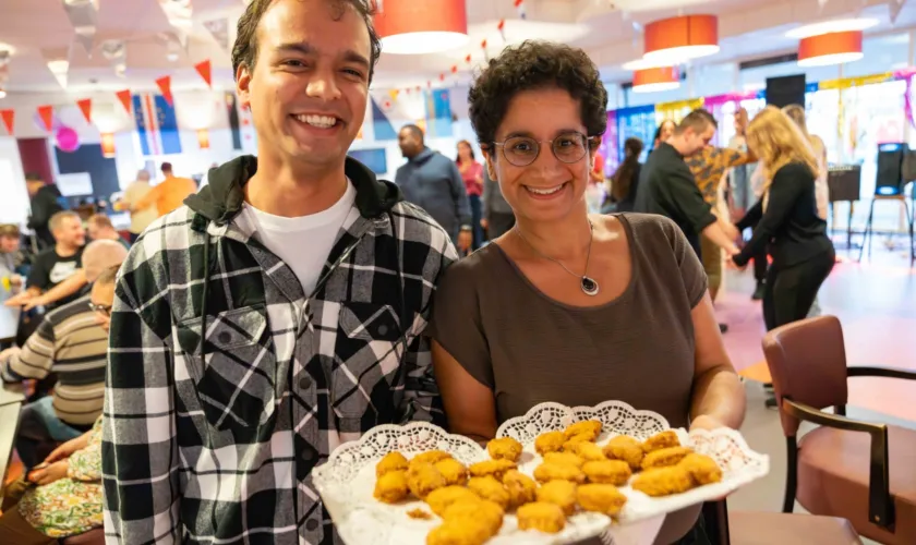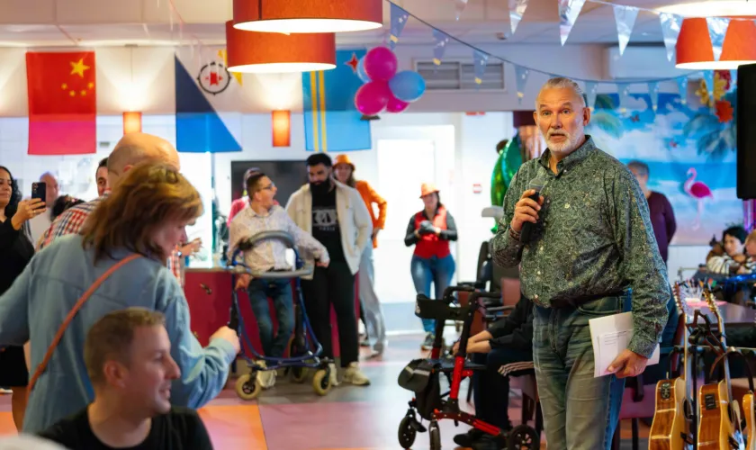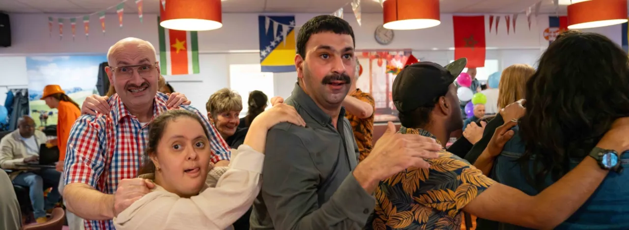 De rode loper ligt uit voor alle feestgangers. Binnen worden ze warm ontvangen en overal hangen kleurrijke slingers en ballonnen. Maar het zijn vooral de mensen zelf die de avond kleur geven. De muziek staat aan en er wordt uitbundig gedanst, gezongen en gesprongen. "Kijk eens hoe iedereen op de dansvloer staat en lekker losgaat met elkaar”, zegt leerwerkcoach Marjon Slijper stralend. “Blijer kan je mij niet maken."