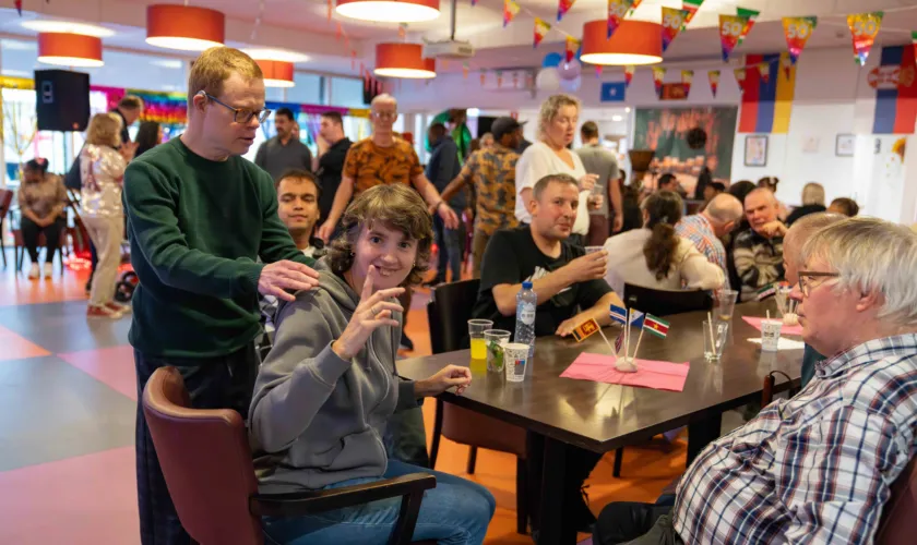 Kreileroord is niet alleen open voor cliënten van Pameijer, maar heeft ook een laagdrempelige inloopfunctie. "Onze deur staat open voor wijkbewoners. En die komen volop", vertelt inloopcoach Daria Maanster boven de feestmuziek uit. Ze legt uit dat ze de oren en ogen van de wijk zijn. “Mensen komen voor een praatje, een kop koffie of een maaltijd. Dan zien en spreken we de mensen die thuis vereenzamen of met hulpvragen zitten waar ze zelf niet uitkomen. Als we dat signaleren, verwijzen we ze door naar organisaties die deze mensen kunnen helpen. Zelf organiseren we activiteiten om mensen in hun eigen kracht te zetten, zodat ze zolang mogelijk zelfstandig kunnen blijven wonen. Iedereen mag hier zijn wie die is. We zijn een vangnet voor wie dat even nodig heeft."