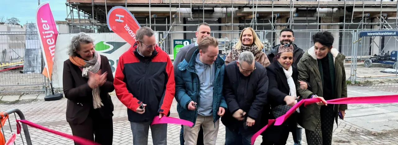 Om te vieren dat de bouw nu echt al goed op gang is, sloten we het bezoek feestelijk af met het doorknippen van een lint.
